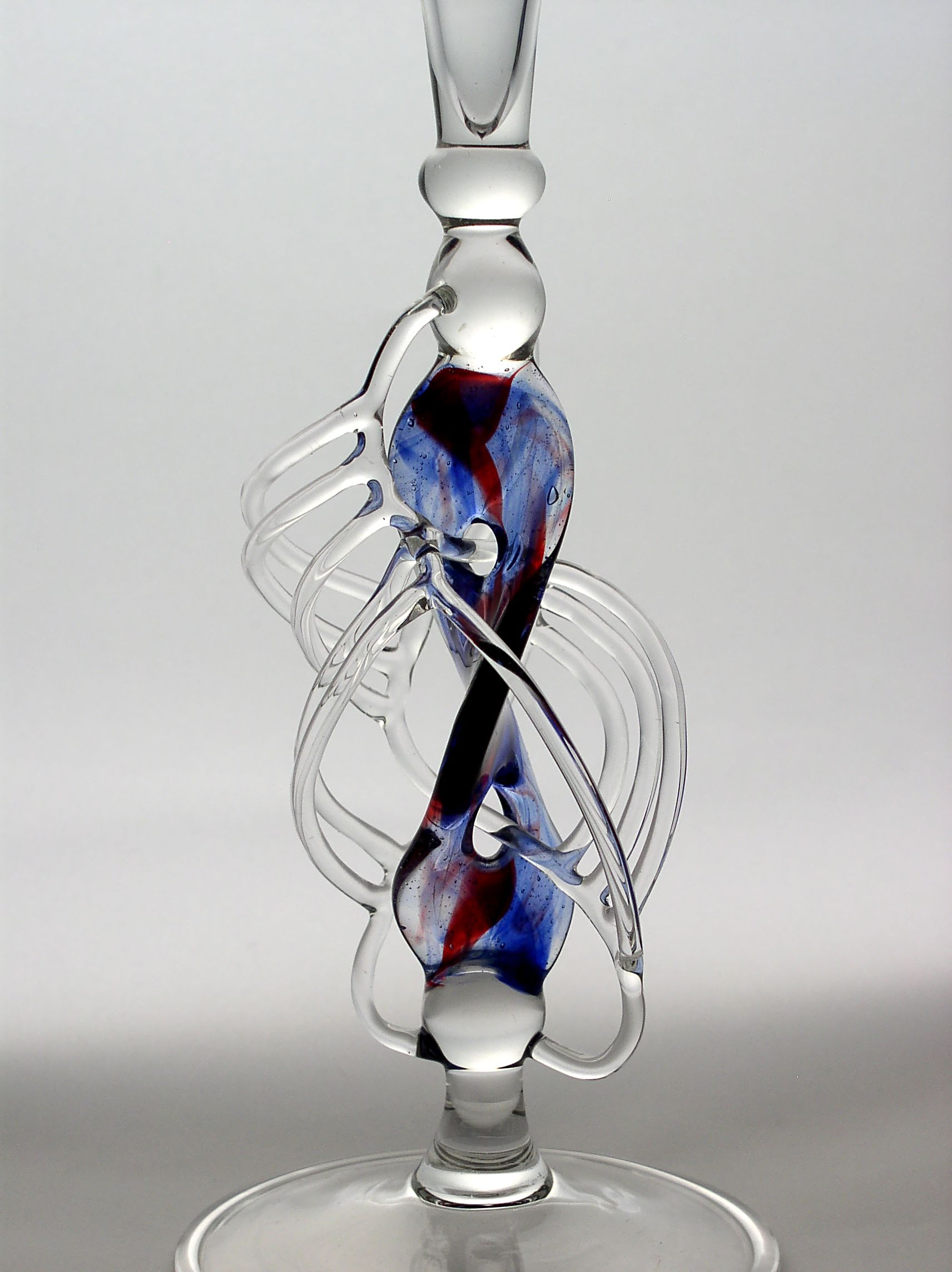 Die farbigen Bereiche der Gläser entstehen aus Farbglasstäben, die auf das klare Glas aufgeschmolzen werden oder aus Farbglasröhren, die in Montagetechnik zusammengesetzt werden.